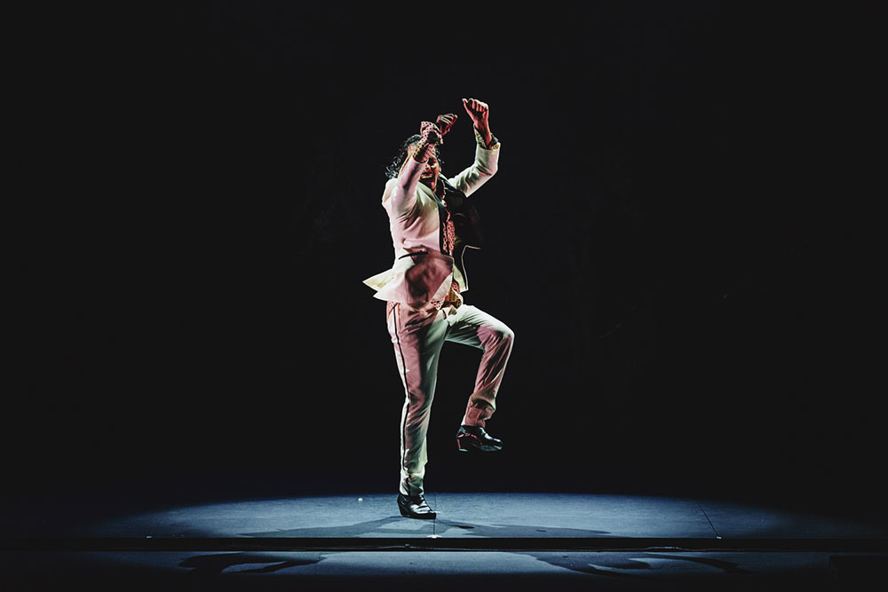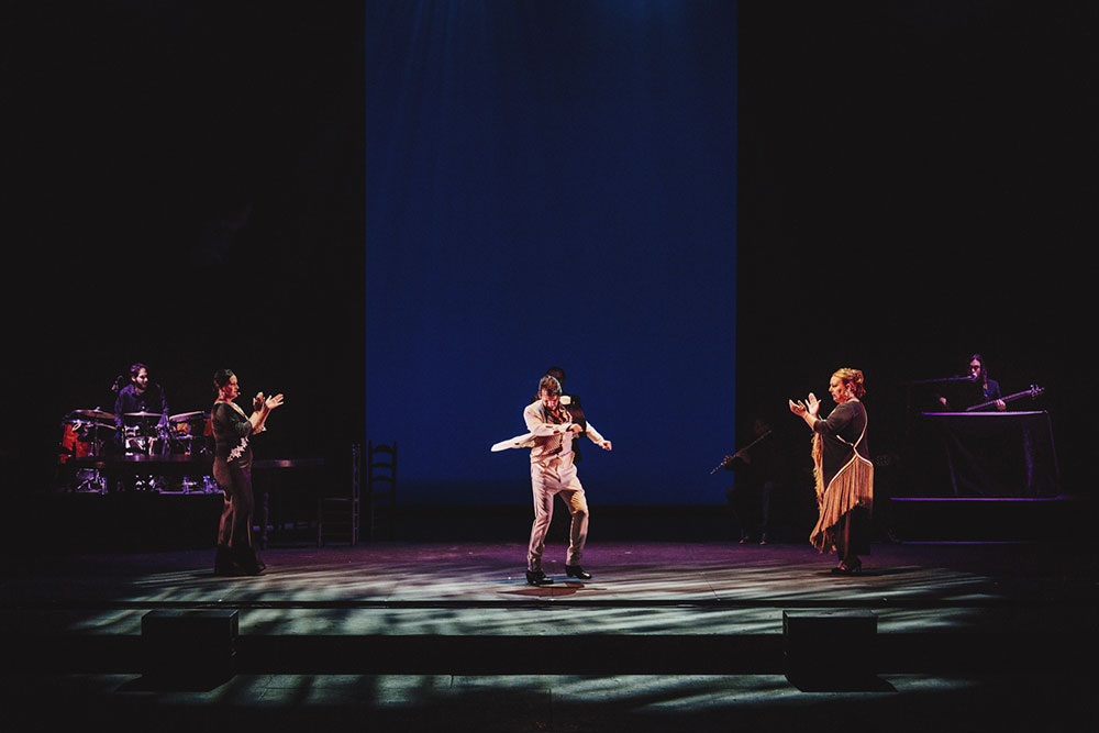 Y hay texto, sí. Pero no habla de dioses griegos ni la esencia del ser humano ni de opresiones. De hecho, no es más que datos biográficos de Juan Manuel Fernández Montoya y una declaración de la intención de entregar el flamenco sin artificio. El título de la obra… cuesta decir “obra” para este tipo de espectáculo medio improvisado… es “Farruquito”. Sin más. Como antiguamente, que se anunciaba la actuación del principal y te apuntabas, no a ciegas sino sabiendo lo que ibas a ver: en este caso, al mayor y más consumado intérprete de una escuela de baile flamenco que encabeza la lista de favoritos de muchos. Farruquito es un genio que ha sabido destilar esencias del baile de patio de vecinos, cruzado con el brillo y disciplina del baile de escenario, dando lugar a un producto irresistiblemente flamenco.