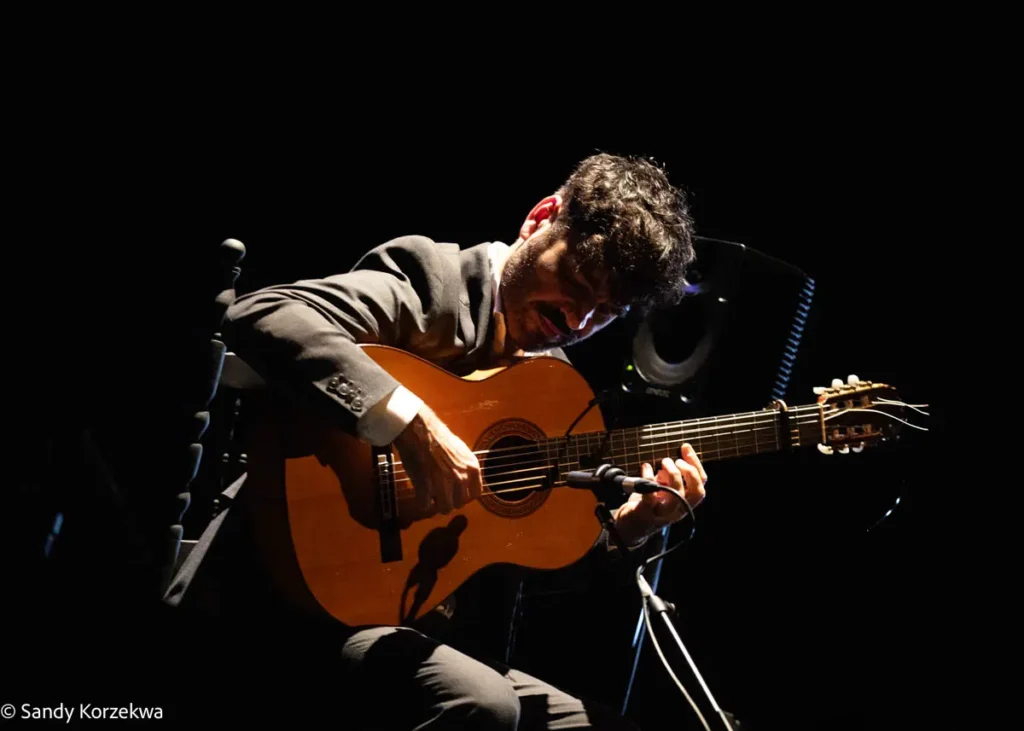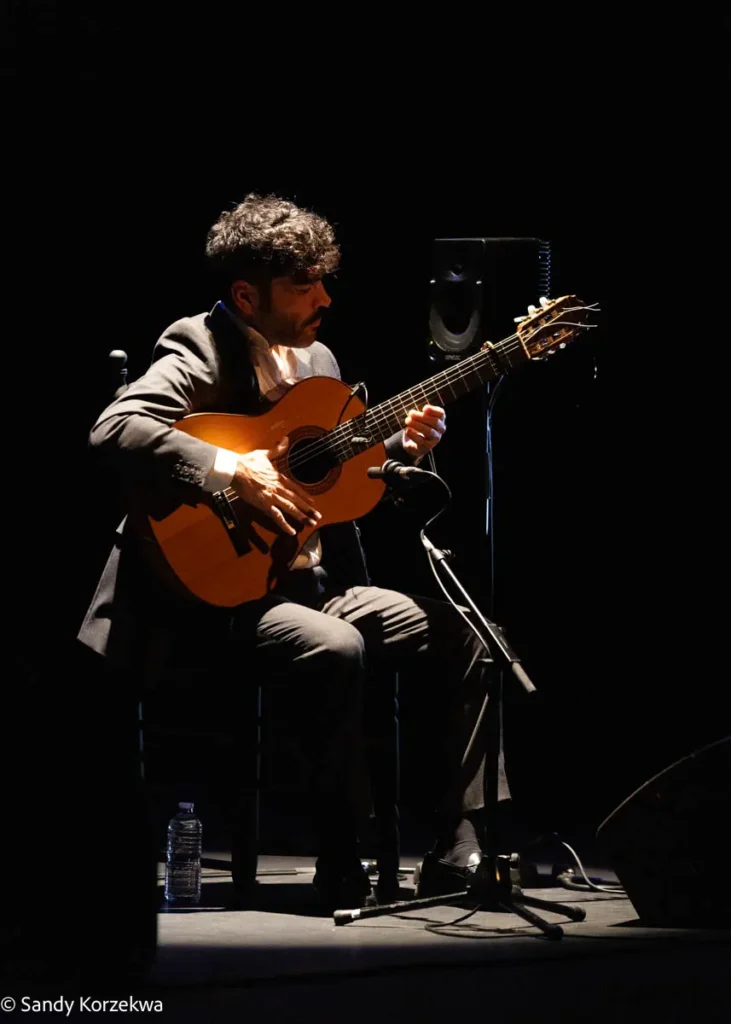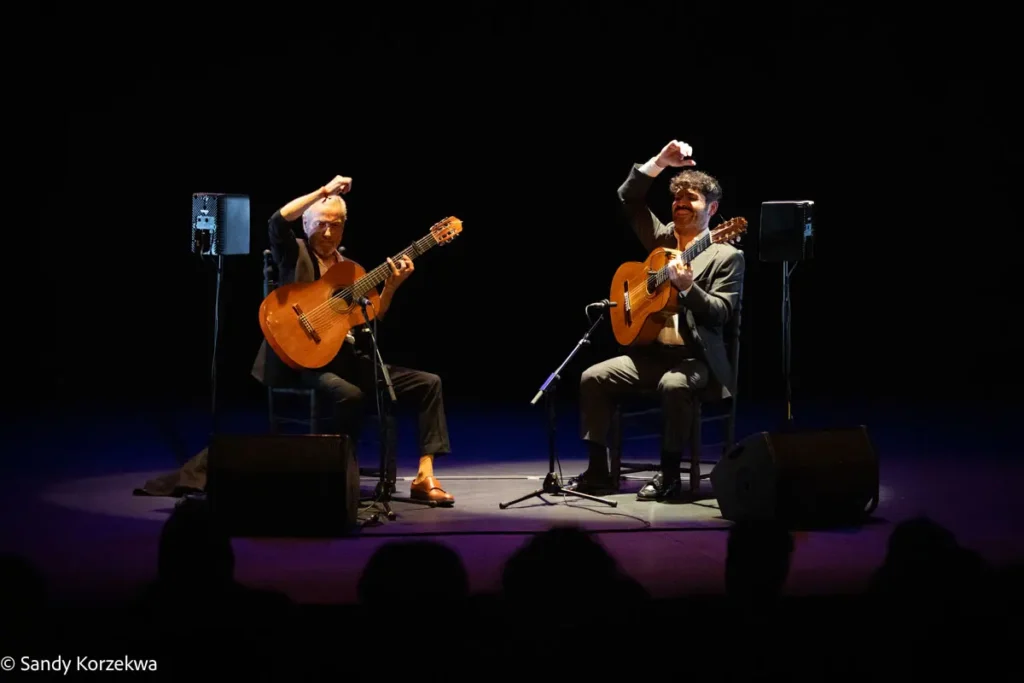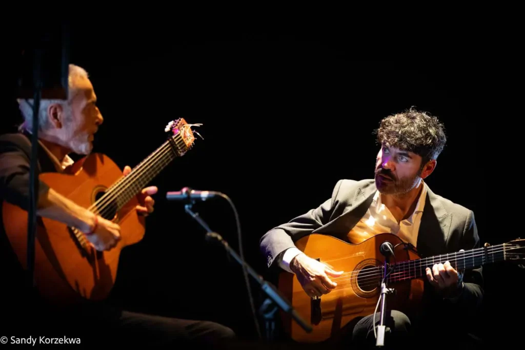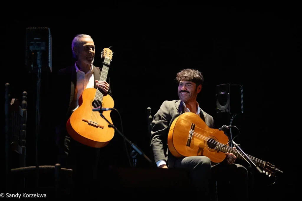 A la fiesta llegamos después de vivir una tarde de ternura y emoción distinta y poco habitual, de la mano de Joselito Acedo (Sevilla, 1979) y su padre y maestro, José Acedo. Ambos construyeron en L’Odeon, la segunda sala del festival, un recital de guitarra estrenado en 2024 -qué refrescante es un recital en el que solo hay guitarras- basado en el repertorio de Niño Ricardo como homenaje a él y a la escuela sevillana, Recuerdo a Sevilla 50 años Niño Ricardo.