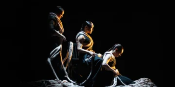 También Raúl Cantizano se vuelve imprescindible. Aquí trasciende su papel de acompañante para convertirse en un tercer protagonista de la historia. Toca con tino y emoción, en el mismo tono en el que se desenvuelve la obra, y tras el encuentro entre María e Isabel (o María y Rosa) se coloca en el centro de la escena: ataviado con casco romano y cordón a modo de banda, no solo toca sino que canta, baila y jalea. Su aparición con guitarra eléctrica para interpretar un Magnificat que desemboca en unas sevillanas corraleras demuestra que la propuesta de Moreno no teme a la experimentación ni a la mezcla de registros.