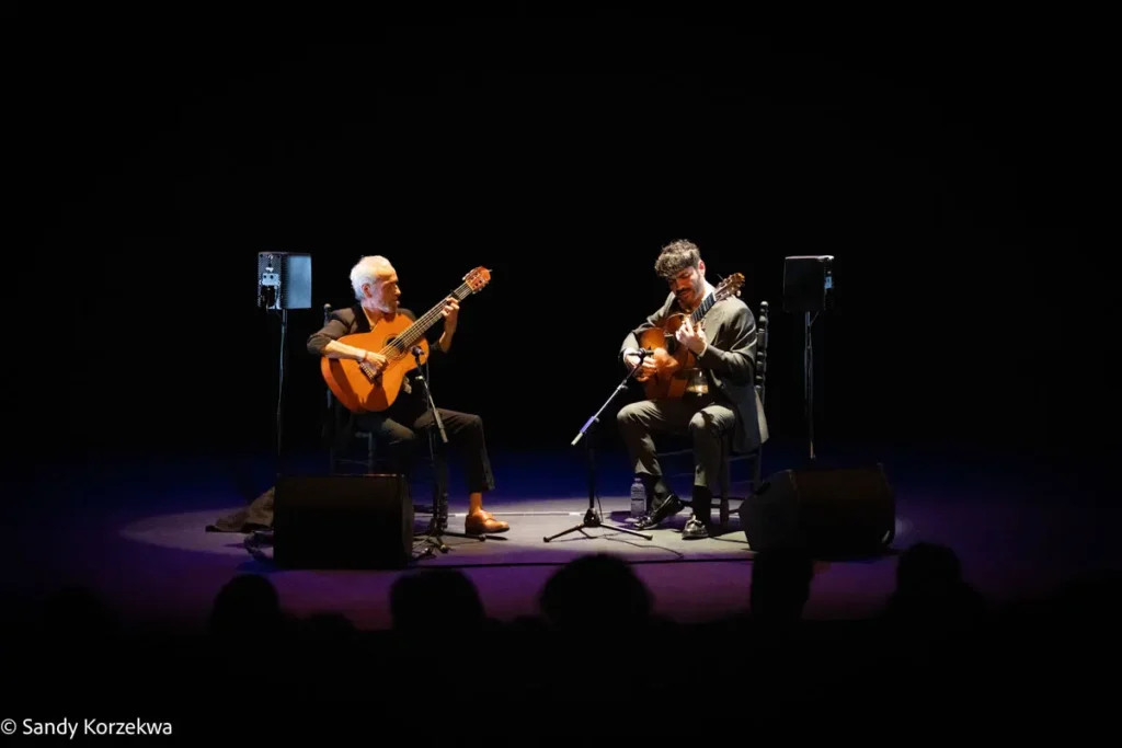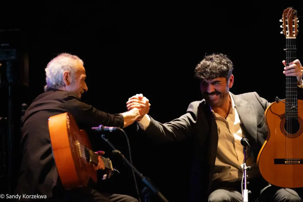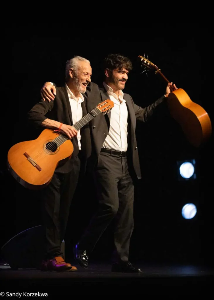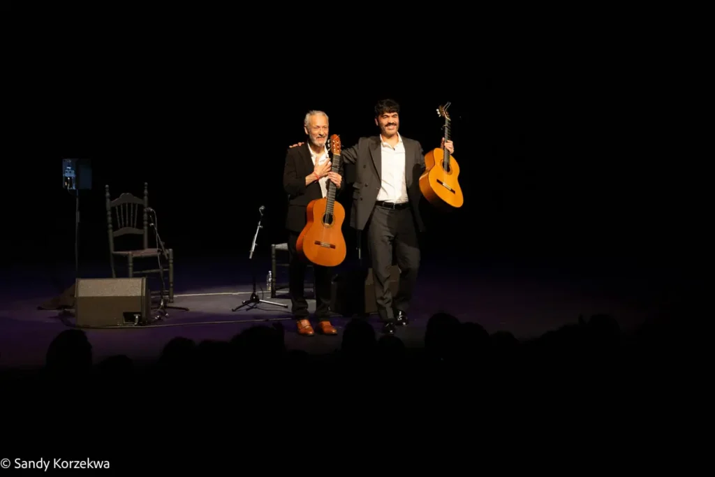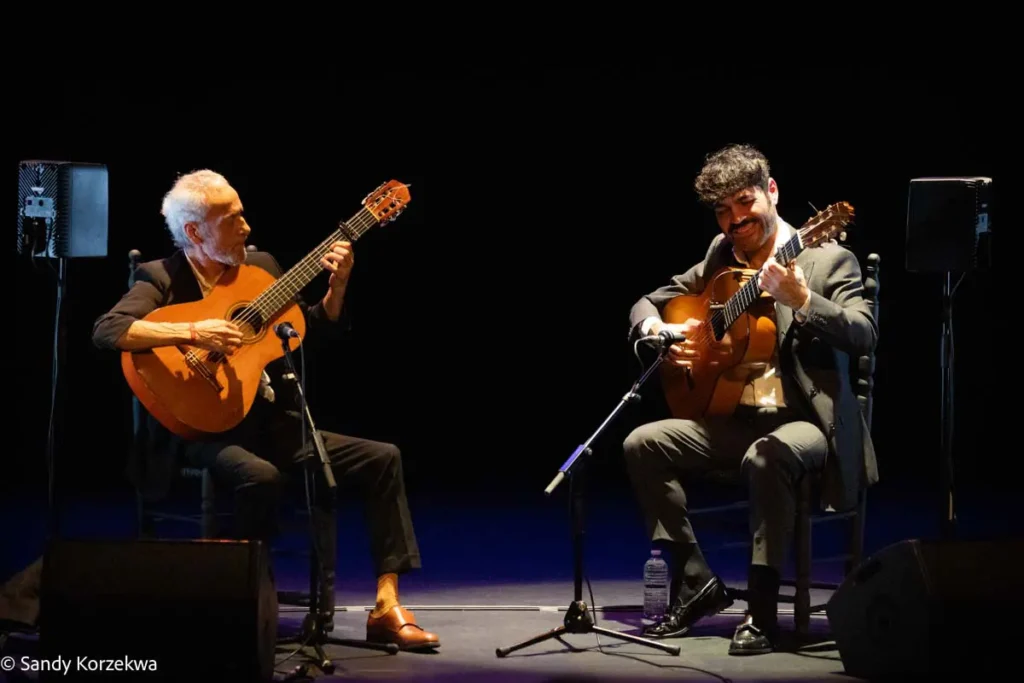 A la fiesta llegamos después de vivir una tarde de ternura y emoción distinta y poco habitual, de la mano de Joselito Acedo (Sevilla, 1979) y su padre y maestro, José Acedo. Ambos construyeron en L’Odeon, la segunda sala del festival, un recital de guitarra estrenado en 2024 -qué refrescante es un recital en el que solo hay guitarras- basado en el repertorio de Niño Ricardo como homenaje a él y a la escuela sevillana, Recuerdo a Sevilla 50 años Niño Ricardo.