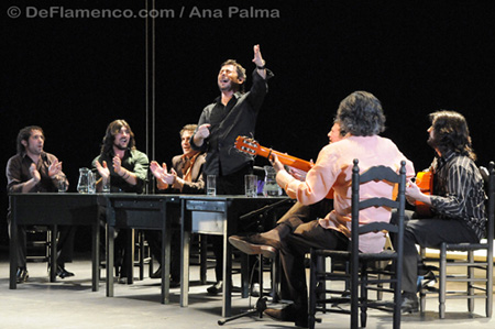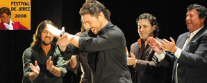 Miguel Poveda “Sin frontera” At the Villamarta Theater, on the next to last day of the festival, Jerez finally received the tribute the city wanted and fully deserves, and it came from a Catalonian no less, young veteran singer, Miguel Poveda. The history of cante is well-populated with famous rivalries, more or less friendly: Chacón and Torre, Mairena and Caracol, Camarón and Pansequito… But the sort of mutual admiration that has formed between Miguel Poveda and Luis el Zambo is unprecedented. And even more surprising considering one is Catalonian and the other from Jerez, one the winner of the National Prize for Music, the other a lovable singer who tended his fish shop until just a few years ago, a gypsy and a non-gypsy, from different generations… In fact, the only thing they have in common is their boundless love for flamenco, and the desire to share it. In 2008, flamenco has already crossed nearly every frontier, and this is the message Miguel Poveda sends out with the title of this work “Sin Frontera”, ‘without frontiers’. Nowadays even the most stubborn hardliners concede Poveda a privileged place in the panorama of cante. It’s no longer the curiosity of a young boy who won four prizes, including the coveted Lámpara Minera, at the 1993 La Unión context. It’s no longer “he doesn’t sing badly for a Catalonian” or “he sure likes Jerez cante a lot”. Now, it’s Miguel Poveda, major star of cante flamenco. The familiar scene of the tavern, the wooden table, knuckles rapping out compás, the glasses of wine… But this time, miracle of miracles, the scene is fresh and natural. Everyone is from Jerez except Miguel Poveda and his regular guitarist, Chicuelo. Seated around the table are Luis el Zambo, Moraíto, Andrés Peña, Carlos Grilo and El Lúa. Poveda and Chicuela are seated to one side of the stage workinga taranta…then back at the “tavern”, Luis sings soleá and soleá por bulería. Following in the same compás, Andrés Peña, the much under-rated dancer, more discreet than other dancers from Jerez, and possibly for this reason, more sincere, even more flamenco. Then Miguel brings us back to eastern Andalusia with his malagueñas, including a wonderful interpretation of the malagueña of la Peñaranda and ending with abandolao with the contemporary sound guitarists now give this compás. Then back to Jerez where Poveda, now seated in the tavern, trades tonás with el Zambo, and you can feel the perfect communication, the mutual respect and the absence of frontiers between the two. The simple set decoration and novel back-lighting is very effective, suggesting the ambience of a tavern at night, and then with the first light of day. Moraíto and Chicuelo play tientos and tangos for Miguel. The two musicians also speak the same flamenco language; the energy of their bulerías duet makes you wish you never had to hear another jazz chord played to free-form compás, and gets the audience seriously excited as no other instrumental number has throughtout the festival. When el Zambo gets into siguiriyas with his rich voice, it makes you wonder why those voices are no longer fashionable. Andrés dances alegrías, and one feels grateful for his elegance, honesty and restraint. He does a long bulería without music, without cante, and nearly without palmas; simple things done well go a long way. Daylight begins to filter into the tavern and the inevitable fiesta finale comes together with each one doing his little dance. And when morning finally arrives Luis and Miguel are left alone at the table to sing soleá to each other to the compás of their own knuckles The inescapable encore brings the surprise of Mr. Diego Carrasco to sing the bulerías song “Alfileres de Colores” with Miguel. A wonderful celebration of the universality of flamenco that makes possible this bonding of two maestros. “Sin Frontera” is the Jerez fiesta all flamenco fans dream of, the dream Miguel Poveda once had and managed to turn into reality. Antonio Reyes, Manuel Moneo Young singer Antonio Reyes from Chiclana was in charge of the first part of the double program at the Bodega de Los Apóstoles. The first strains of “En un trono de marfil, mi sangre toca las palmas…” reveal his admiration for Manolo Caracol. With the accompaniment of Antonio Higuero, he moves on to tangos played por arriba which always gives a different sound. Antonio then lends his velvet voice and sincere delivery, without special effects, to siguiriyas, finishing off with bulerías and a zambra, both decorated with his wife Patricia’s dancing.