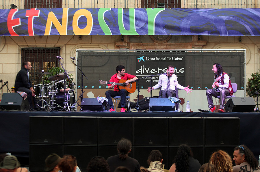 Con el buen sabor de boca de la noche anterior, que se completó con el funky man Juan Rozoff, el cual nos sorprendió igualmente por los constantes guiños flamencos y llegó incluso a pedir al público que le acompañara a compás mientras gritaba “¡Viva la Niña de los Peines”!, el sábado 20 de julio tenía programado otra interesante propuesta flamenca, en este caso en la Plaza del Ayuntamiento. Nuevamente de la mano del barcelonés Taller del Musics, se nos presentaba el guitarrista eléctrico flamenco Jaco Abel, el cual ya sorprendiera hace unos años con su debut discográfico. Para este envite se hice acompañar de Diego Mendoza a la percusión, y Oliver Haldón a la guitarra flamenca, pero sin duda la sensación de la tarde noche alcalaína fue el cantaor José El Salao. No habíamos tenido la oportunidad de escucharlo nunca en directo, y nos sorprendió gratamente. Pese a los pequeños problemas que hubo con la sonorización, en ningún momento se vino abajo, y nos recordó al gran cantaor de la Isla del León. Cuando creíamos que el fenómeno camaronero ya estaba casi extinto, este joven cantaor nos ha vuelto a poner en la senda del magistral José Monje Cruz, bueno, si es que alguna vez nos habíamos salido, que lo dudo. Un repertorio a base de tarantas y cartageneras, seguiriyas, tangos, rumbas, soelares y bulerías. También supo demostrar su buen hacer flamenco Jaco Abel con varios números instrumentales a compás, donde desgranaba con increíble facilidad las falsetas con su guitarra eléctrica. Todo un nuevo éxito del flamenco en Etnosur, y desde aquí animamos a Pedro Melguizo y su gran equipo que no ceje en el empeño de seguir programándolo. Por lo que ansiamos las llegada de una nueva edición.