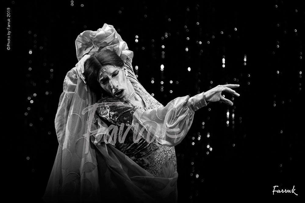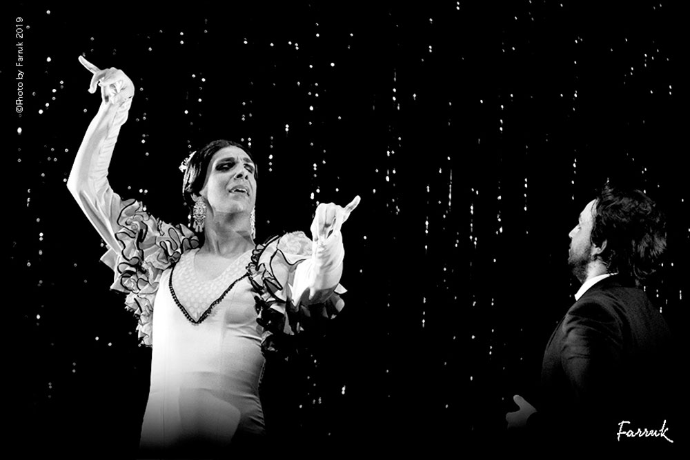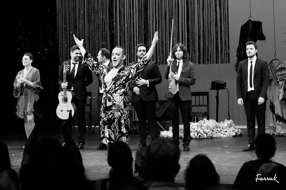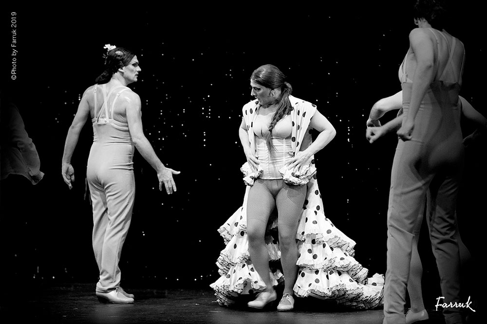 Diversos elementos conforman nuestras respectivas identidades: la edad, la nacionalidad, apariencia física, creencias espirituales, gustos…pero ninguno es más contundente y definitorio que el género. La identidad sexual. Independientemente de la vida íntima de cada uno, o eres hombre o eres mujer. Con ese bagaje, la imaginación hecha realidad de Liñán viene paseando por nuestros pensamientos más ocultos y los revuelve con la facilidad de un túrmix. El brillante coreógrafo, director y bailaor granadino, tiene la extrema osadía de vestir a un cuerpo de baile masculino de ropa flamenca de mujer – volantes, lunares de colores, batas de cola, pendientes con flores a juego y mantones con flecos.