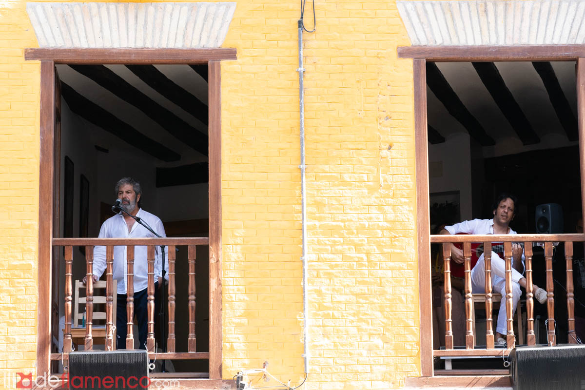 Las once de la mañana no parece buena hora para cantar flamenco pero los negocios de la calle en la que se crio Sabicas están abiertos, la tienda de cuchillos, la de comida para mascotas, el acceso al mercado y al frontón… sólo la tienda de jamón luce a media persiana bajada. Ahí aparece el cante de Guadiana de la saga de los Porrina de Badajoz. Somos pocos, pero nos gusta (lo dijeron los Stones) . Por encima de la calle una grúa sigue a lo suyo, ajena al arte.