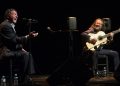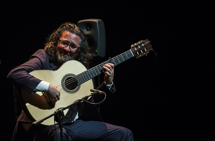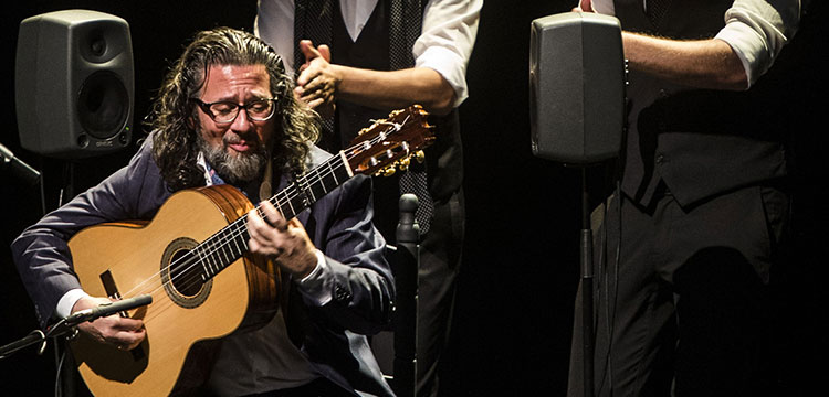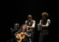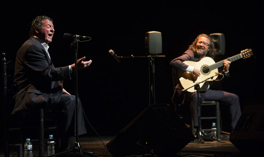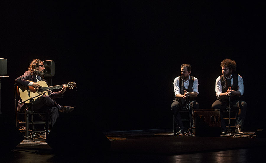 El espectáculo comenzó con un poema y una voz cavernosa y firme que nos cuenta entre penumbras que la guitarra es sonanta y que en Jerez es una cosa muy seria que se desarrolla entre dos barrios de estilos bien diferenciados y aparece José Gálvez con su guitarra flanqueado por el compás mayúsculo de Manuel Cantarote y Juan Diego Valencia y se arrancan por bulerías que es por donde la mayoría suele acabar. Pero ¡ay! El sonido es atronador.