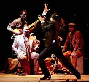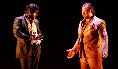 Ficha Artística: Baile: Joaquín Grilo; Guitarra: Juan Requena; Cante : José Valencia y Carmen Grilo; Bajo y Mandolina: José Carmona; Percusión: Paquito González; Palmas: Los Melli. Parece que hoy en día a los artistas les cuesta presentar un espectáculo que no lleve una historia implícita. Una trama argumental que le de forma a los números que plantea. Esto es un arma de doble filo ya que si quieres mostrar una película, debes cuidar mucho el guión para que no resulte un “tostón”. Aunque hay veces que el papel del protagonista está por encima de cualquier guión mediano. Esto es lo que le pasa a este espectáculo, que se basa en una historia que parece no conectar ni tener un mensaje que te llegue, sin embargo el reparto artístico salva y justifica con creces el viaje hasta el teatro. Leyenda Personal nos muestra la vida de Joaquín Grilo contada a través de su baile. La historia presenta alguna situación original en determinados momentos, como cuando se convierte en marioneta movida por los ineludibles hilos del dinero y el mundo. Y otras que no dijeron nada como el número con la mecedora o el libro de sus recuerdos. No obstante, lo importante del espectáculo (afortunadamente) no es la historia en sí, sino el fondo del espectáculo, o sea, el baile del protagonista, su toque personal, su concepto rítmico, el toque y el cante que lo motivan, que rayaron a excelente nivel artístico. El baile del Grilo se mueve entre la gracia del baile jerezano por fiesta elevado a la categoría de profesional virtuoso, el concepto plástico y artístico tan propio y el surrealismo moderno que su personalidad emana. No basa su baile en la técnica, sino que la usa para sacar a la luz su personalidad tanto en su lado dramático como el canalla e iconoclasta. En esta ocasión el bailaor me dio la impresión de haber logrado un equilibrio entre estas facetas que lo convierte en un artista con más peso, con más fundamento. Es digno de mención el papel de José Valencia en este espectáculo, le da una profundidad que realmente impresiona. Su forma de decir el cante dobla los tercios y busca senderos personales por donde llevar la melodía para resolverla a placer. Hace que no quede todo en una halago de fuerza sino también de conocimiento, capacidad y concepción melódica y rítmica. El momento de cante y baile en el cierre por Siguiriyas con la Cabal de Sernita de Jerez fue simplemente magnífico. La energía y emoción que desprendieron levantó al público de los asientos. También Carmen Grilo supo estar a la altura con una magnífica Bulería en la que sacó brillo a su poderosa garganta. El baile de Joaquín dio plasticidad al cante de su hermana. En general es un buen espectáculo, con una base muy flamenca, y además actual. Rico en fuerza y compás. Con un Joaquín Grilo más asentado en su baile, extravagante por momentos, pero sin abusar. Con dos voces que de por sí justifican cualquier espectáculo y con un repertorio acertado. |
