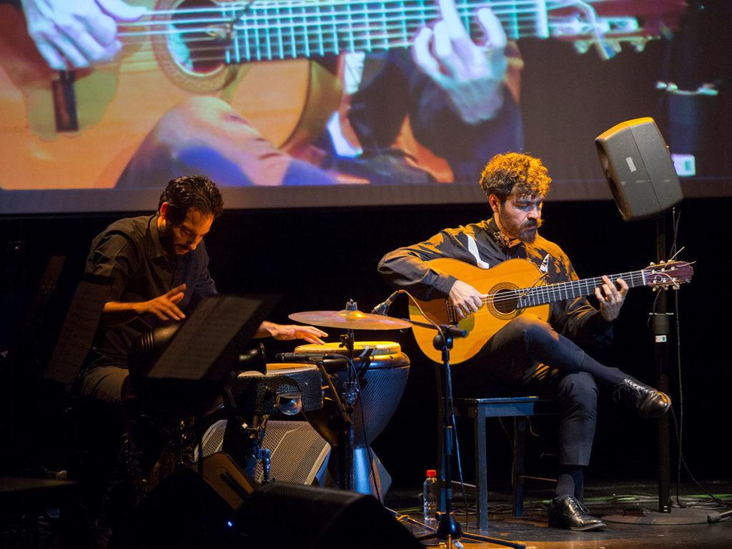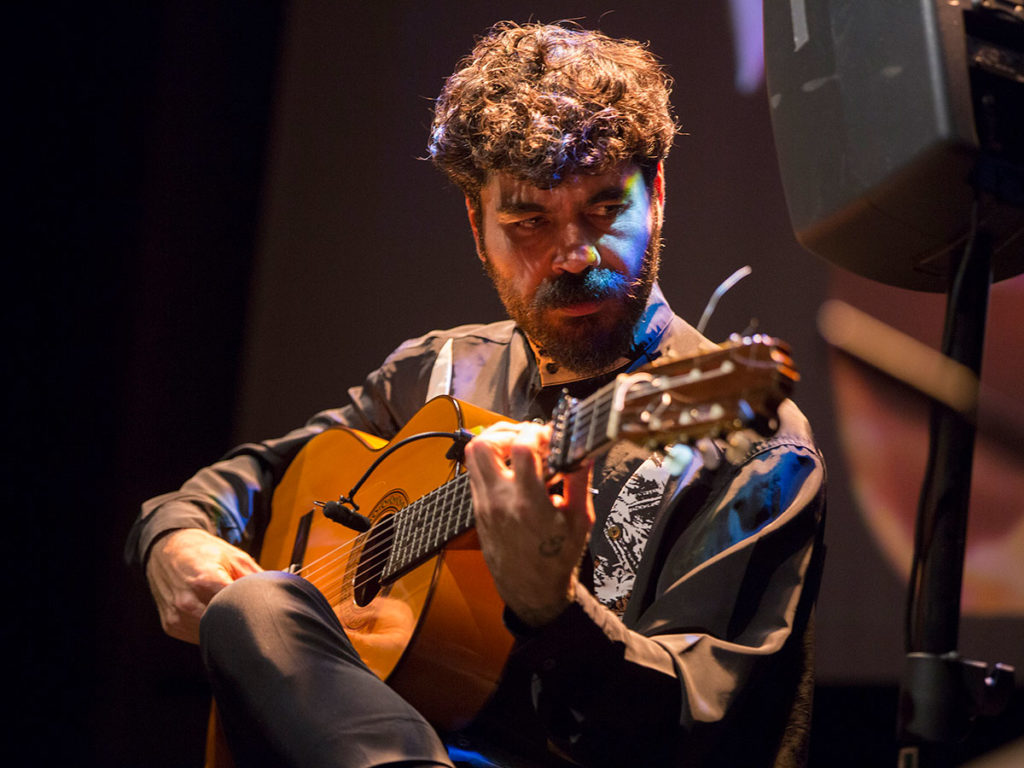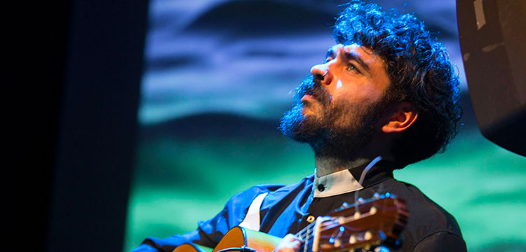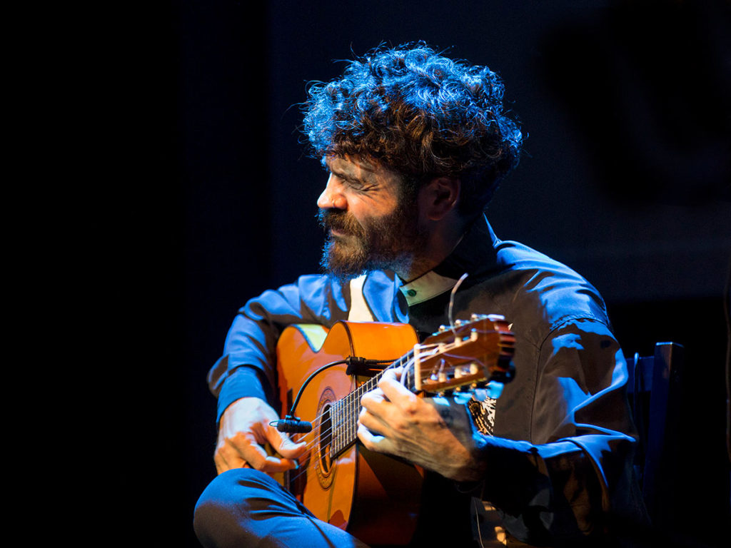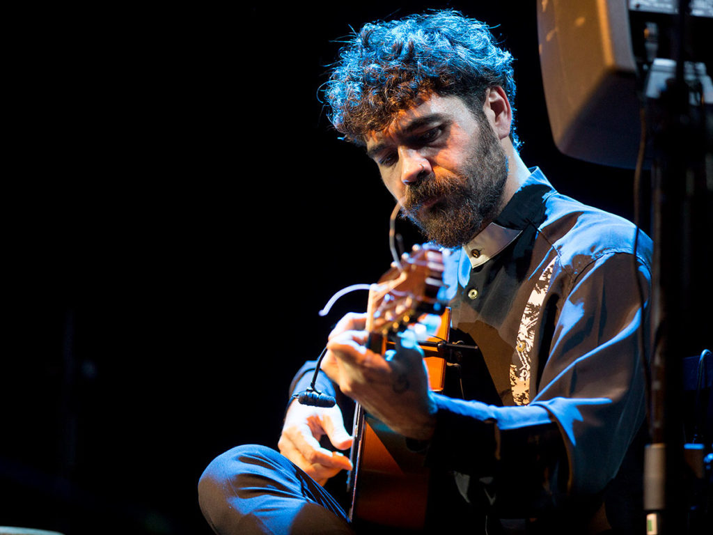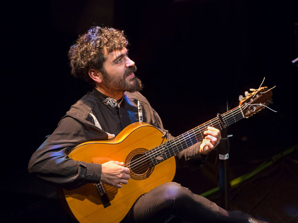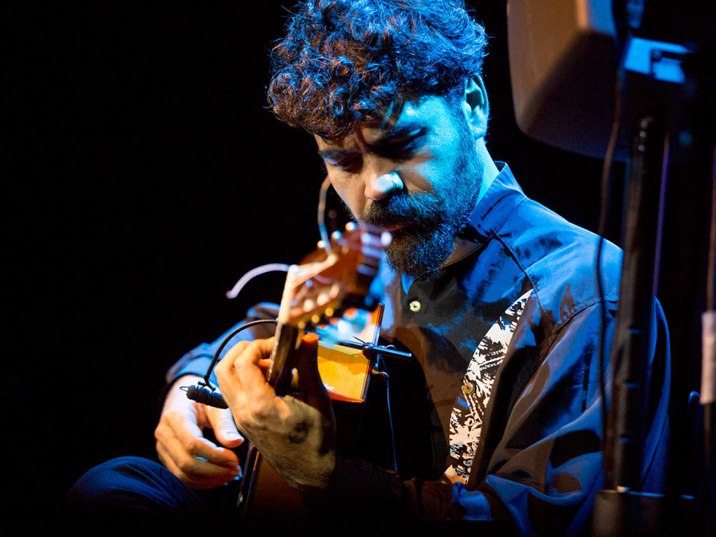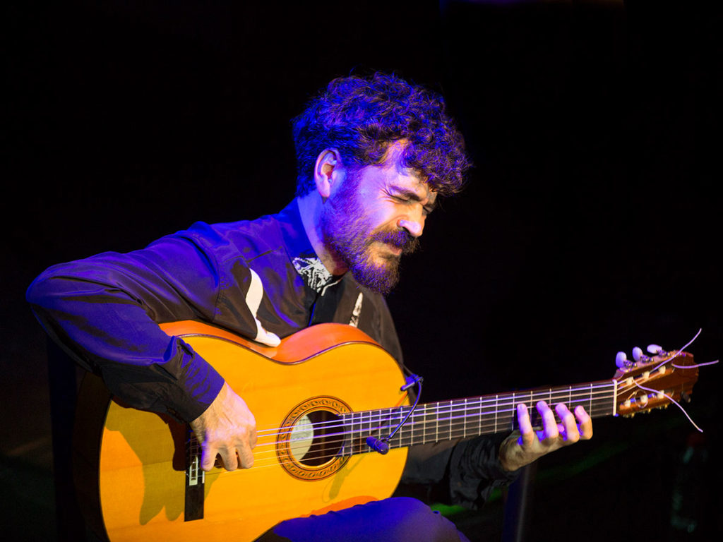 Se nota, por tanto, que sus bulerías no salen del estudio sino de la experiencia de vivir y que sus soleares solemnes beben de todas esas voces rotas y anónimas que aún golpean por su barrio en doce tiempos. Igual que en el aroma melancólico, pausado y sin prisas de las tarantas y granaínas, con las que abrió el espectáculo junto al cuarteto de cuerda ‘Flamenco Strings’, nos hizo recordar el toque corto de Manuel Molina o la sonanta colorista de su tío, Rafael Riqueni, quien le animaba desde el patio de butacas.