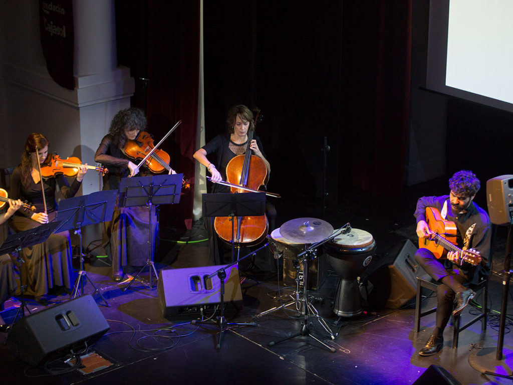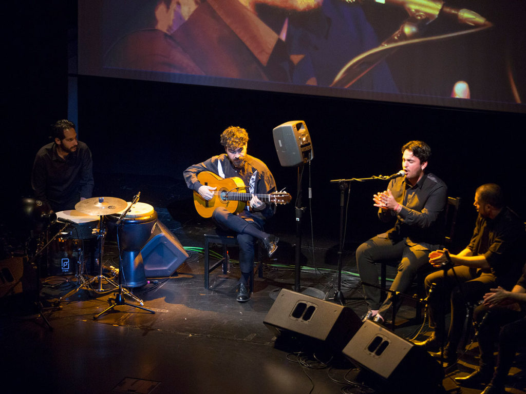 Espectáculo: Triana D.F. Elenco. Guitarra: Joselito Acedo. Percusión: Paco Vega. Palmas: Manuel Valencia y Juan Diego Valencia. Cante: Ismael de la Rosa. Flamenco Strings Cuarteto: Amaia Martínez, Cretchen Talbot, Raquel Batalloso e Irene Fernández. Fecha: Jueves 21 de noviembre. Ciclo: Jueves Flamencos de Cajasol. Aforo: Casi lleno.