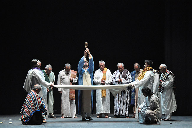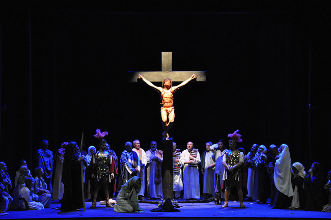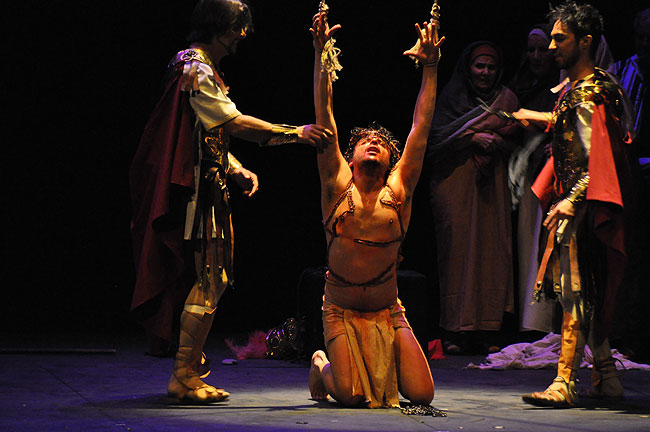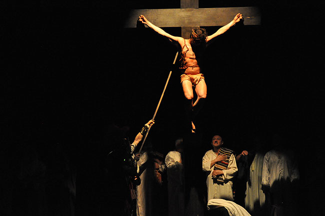 Text and photos: Antonio Conde Juan Andrés Maya is currently the most authentic representative of flamenco in Granada. You see his name in most flamenco happenings in this city, along with that of Iván Vargas and Jara Heredia…the family is always close at hand. He’s full of ideas, and he just as soon wears boots to dance with Canales, as Miguel Poveda is singing soleá for him. His personality allows him to experiment in areas not directly related to flamenco such as when he puts on the guise of an actor and dresses in a tunic. And that’s just what he did. In order to go to this show, you had to wear glasses which were not looking for flamenco. This was the dancer’s personal vision of The Passion, the last days of Christ. Because flamenco-wise there was very very little. Although he had already warned us ahead of time. It’s a different kind of work in which theater takes precedence over flamenco. Nevertheless, he is flamenco, like it or not. The story begins on Palm Sunday with Christ’s (Juan Andrés’) entrance in Jerusalem. Brief flamenco moments quickly come and go to make way for the play. More than thirty individuals made up the rest of the cast throughout the night, playing everything from citizens to followers to apostles. The various scenes depicted the last supper, the capture in the olive grove, etc… Ivan Vargas, outstanding in his dancing as well as his interpretation of Judas, added dimension to the presentation, and the Granada Orchestra did a fine job providing appropriate music. Manuel Font de Anta’s “Amargura” sounded when Barrabas was liberated while Juan Andrés as Christ was crucified. If anything is noteworthy in this work, it is the straightforward way in which the story is presented. A sort of realism that took people by surprise such as when the star dancer appeared to receive an actual whipping. From the rear of the theater he appeared bearing the cross and chaperoned by two guards who continued to whip him without mercy. The staging added yet more realism to the story, and the wardrobe was superb. The cross on which Maya was “crucified” was well over fifteen feet, and there he remained for quite some time. At this point, and again adding a flamenco touch to the story, we could hear the “saeta” of Joan Manuel Serrat in the version popularized by Camarón de la Isla. A story more than known to everyone, but dealt with from a different perspective. It’s hard to tell if Juan Andrés intended to highlight the theatrical angle, or present flamenco and theater in harmony. In any case, the small flamenco bits at the beginning, and Ivan’s dance were simply not enough for those of us who wanted to see some dancing. Even so, it was an excellent presentation which as a theater experience could not have been better.