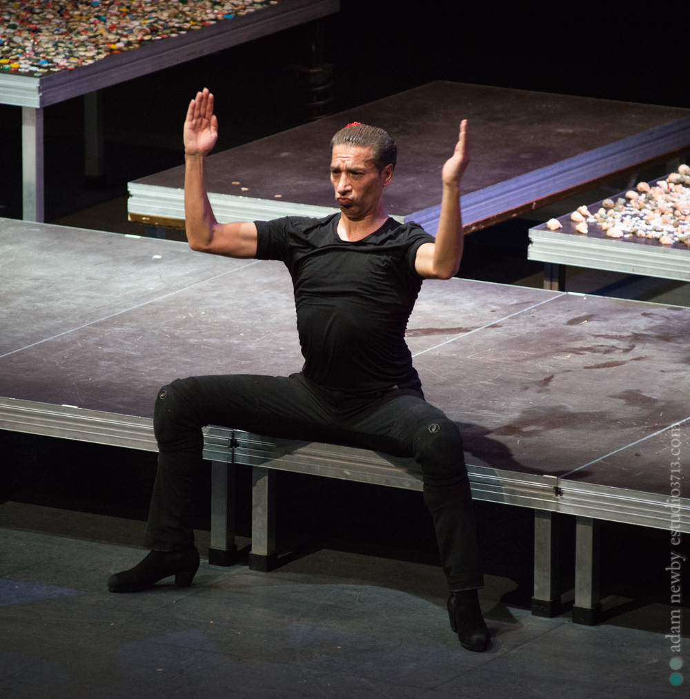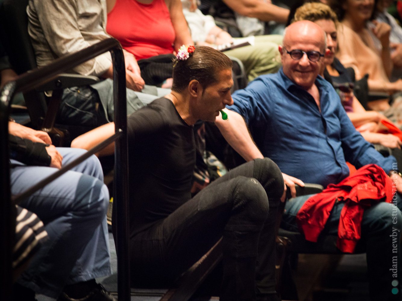 Espectáculo: La fiesta. Idea, dirección artística, coreografía: Israel Galván. Aparato: Pedro G. Romero. Diseño de luces: Carlos Marquerie. Co-dirección musical: Niño de Elche. Colaboración en la puesta en escena: Patricia Caballero y Carlos Marquerie. Elenco: Israel Galván, Bobote, Eloísa Cantón, Emilio Caracafé, Ramón Martínez, Niño de Elche, Alejandro Rojas-Marcos, Alia Sellami, Uchi. Sonido: Pedro León. Fecha: Viernes 18 de mayo. Lugar: Teatro Central. Aforo: Lleno.