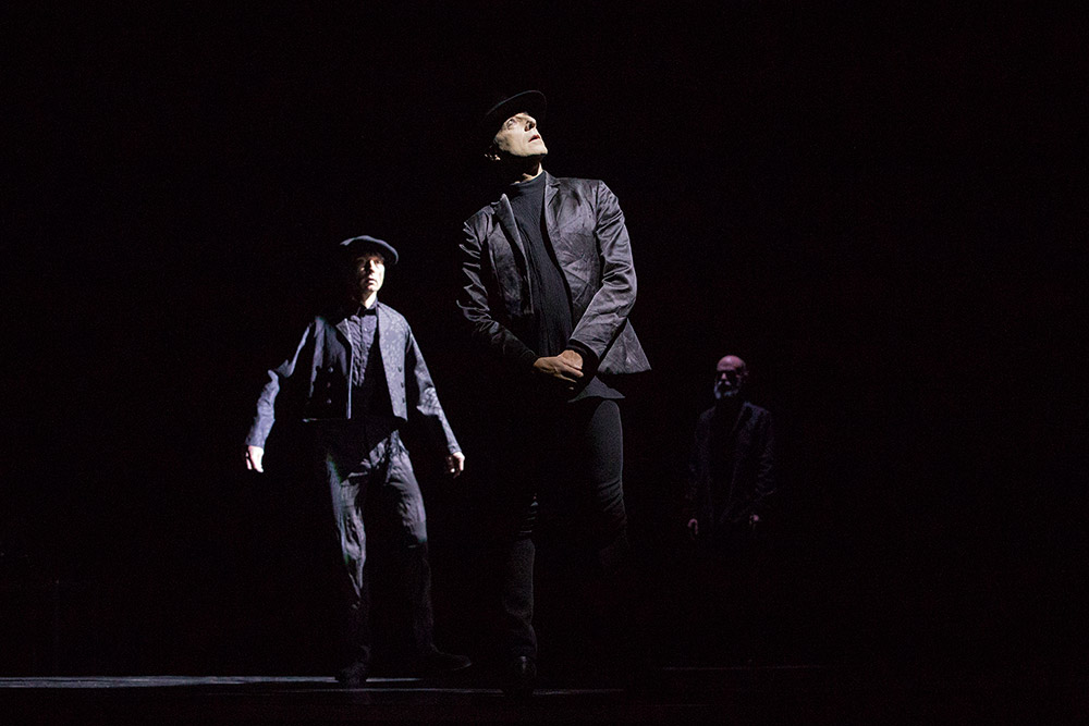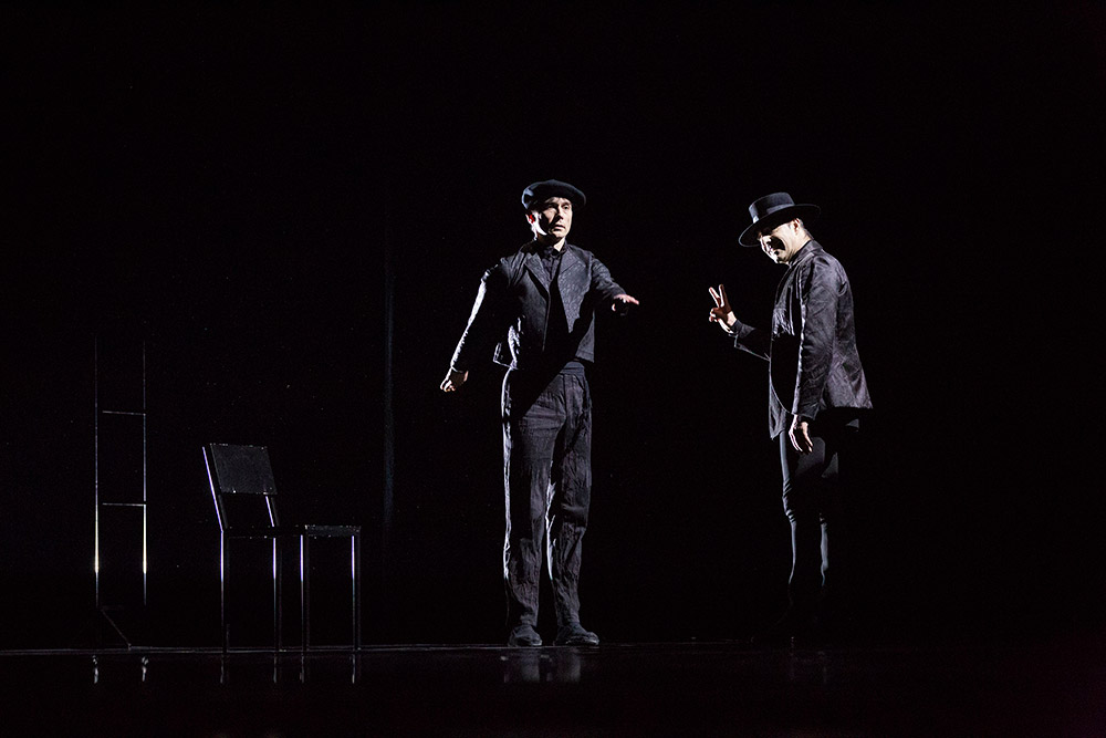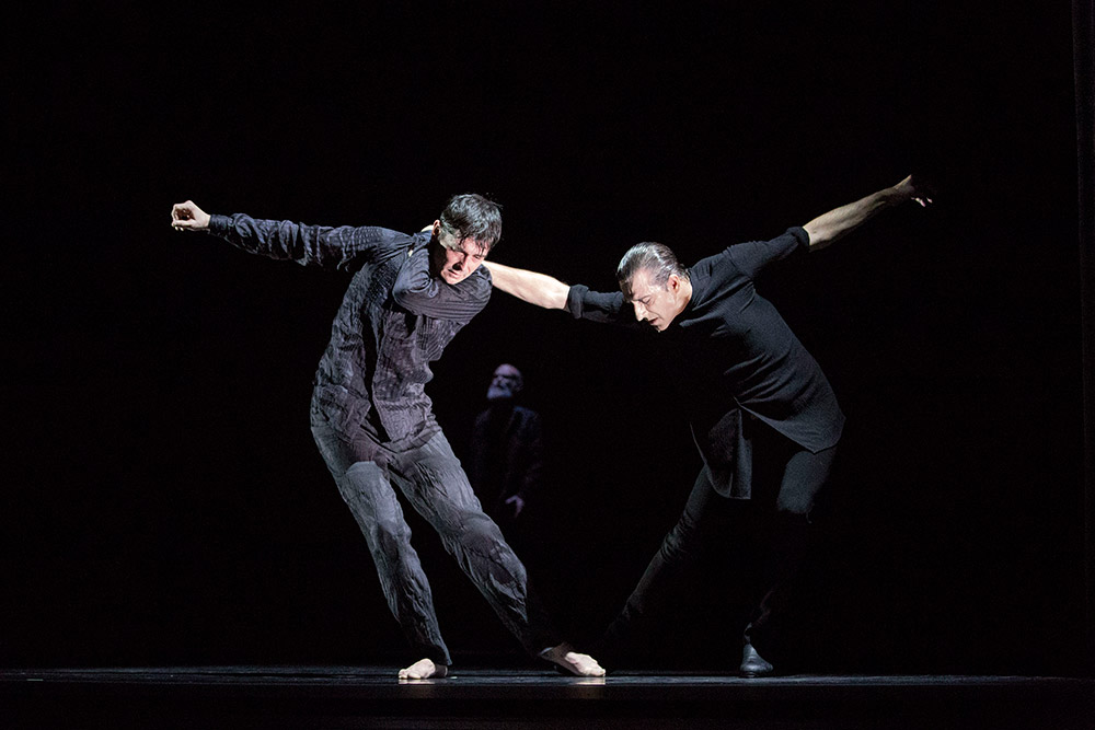 Revisitando también las danzas de raíz pero “huyendo de los clichés” llegaba hasta Nimes el último montaje de Andrés Marín&Jon Maya tras su exitoso paso por la Bienal de Sevilla. Lo que proponen aquí los bailarines en una aproximación, un encuentro, una búsqueda consciente de las raíces compartidas y los credos contrapuestos. De esta forma, en un exhaustivo ejercicio físico ambos van mirándose, escuchándose y sintiéndose en una atmósfera fantasmagórica y una estética muy teatral, en la que la iluminación de David Bernués y el espacio sonoro de Xabier Erkizia terminan siendo dos personajes más de la obra y elementos hilvanadores de las danzas de Marín y Maya. En la dificultad de aunar las dos antagónicas -o no tanto- corrientes dancísticas, una terrenal y otra aérea, pero ambas ásperas y austeras, ayuda el juego, la habilidad de los artistas de recurrir a ratos a lo histriónico, incluso al clown, para abandonarse y converger.