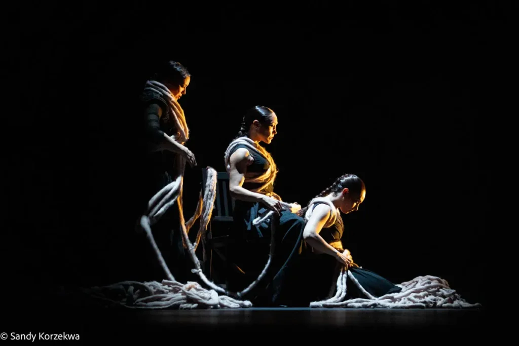 Une atmosphère sombre et mystérieuse traverse la pièce, portée par la lumière de David Picazo, qui fait de l’éclairage la véritable scénographie. Un fil suspendu au métier à tisser complète l’univers visuel, accompagné des costumes noirs de Belén de la Quintana. La musique enregistrée (nous avons toujours du mal à nous habituer à la disparition de la musique live, qui apporte tant et rend chaque expérience unique) est une création d’Isadora O’Ryan, Jesús Torres et Pablo Martín Jones, et dialogue avec l’obscurité de la proposition.
