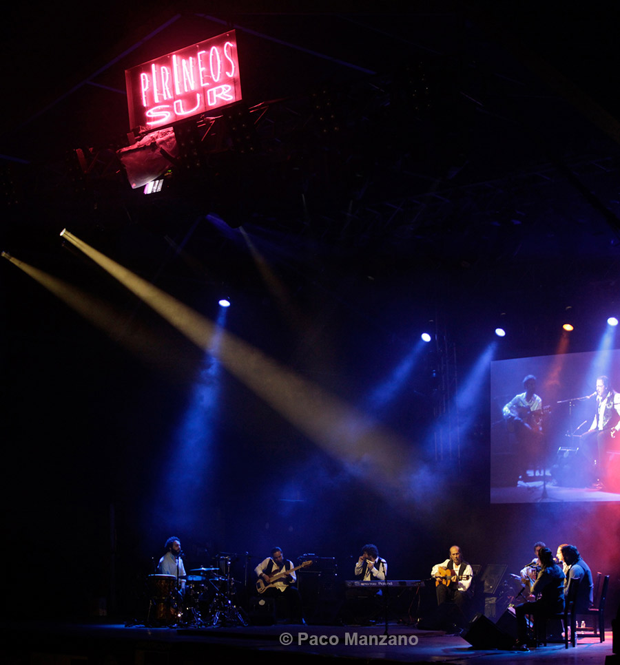 Alain Pérez, bass Antonio Serrano, harmonica and keyboard Farru, Antonio Fernández Montoya, dance Rubio de Pruna, cante David de Jacoba, cante El Piraña, Israel Suárez Escobar, percussion Antonio Sánchez, guitarThe guitar of Paco de Lucía resurfaced yesterday at the Auditorio Natural de Lanuza. This is the second time the guitarist performed at the Festival Pirinieos Sur. The first was in 2004, and nearly a decade later the strings again sound brilliant to the audience who had anxiously awaited the genius of a musician is today a globally recognized flamenco star.
