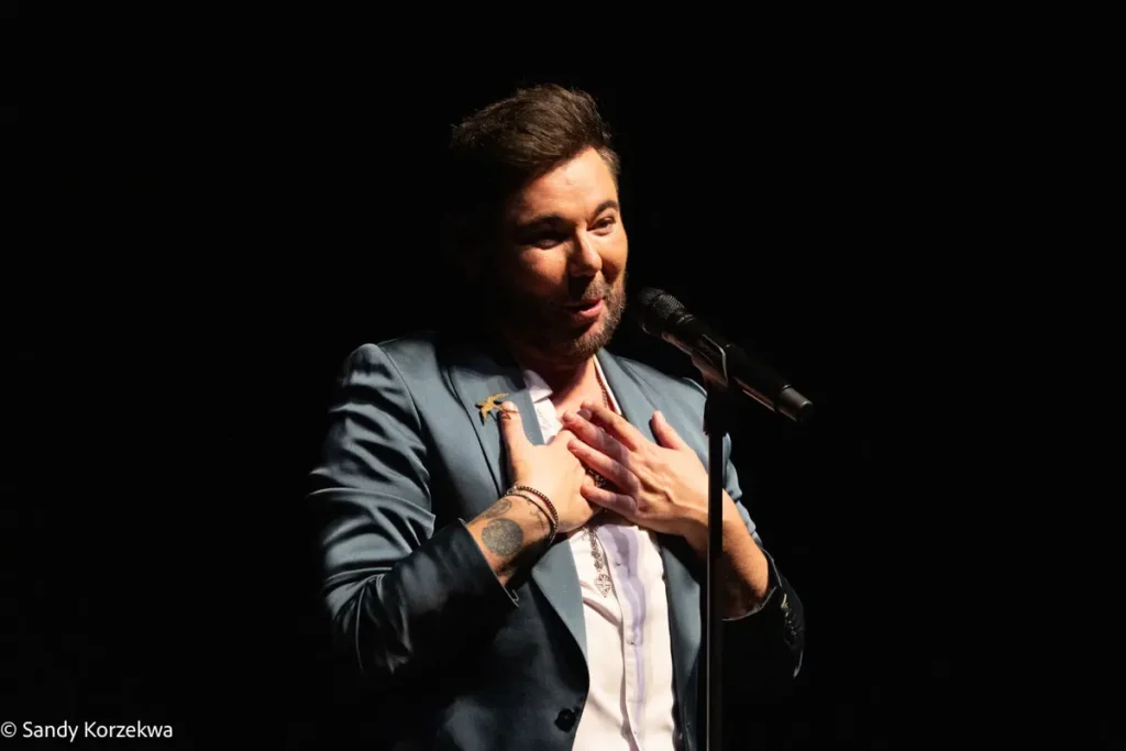 La de Nimes era una parada más de la gira que mantiene desde el estreno del disco y el espectáculo dedicados al Poema del cante jondo de Federico García Lorca, que vio la luz en 2024, y se nota. La sonoridad, la gestualidad e incluso las luces parecen pensadas para espacios de mayor escala: festivales pop de verano -Starlite, Tío Pepe y similares-, plazas de toros, grandes recintos al aire libre. Quizá por eso resultó algo excesivo de volumen y teatralidad en un teatro lleno a rebosar -el propio Poveda comentó que 150 personas se quedaron en lista de espera-, con un público entregado incluso antes de que sonara la primera nota.