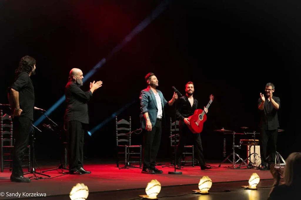 Poveda se entregó como siempre: es un cantaor generoso y sabe sacar partido a su presencia escénica. Nadie puede decir que no lo dé todo cada vez que se sube al escenario. Ni que no lo disfrute. Tras una presentación en off sobre la importancia del poeta y su vínculo con el flamenco, abordó, en un recital que rozó las dos horas, su repertorio habitual: ¡Ay! (caña), Juan Breva (malagueña y verdiales), La Baladilla de los tres ríos (por cantiñas). Para la soleá invitó a Pepe Fernández, guitarrista local que regaló un toque preciso, emotivo y colorido, arropado por un público que lo conocía y lo jaleó antes y después de su intervención: “¡Orgullo de Pepe!”, le gritaron.