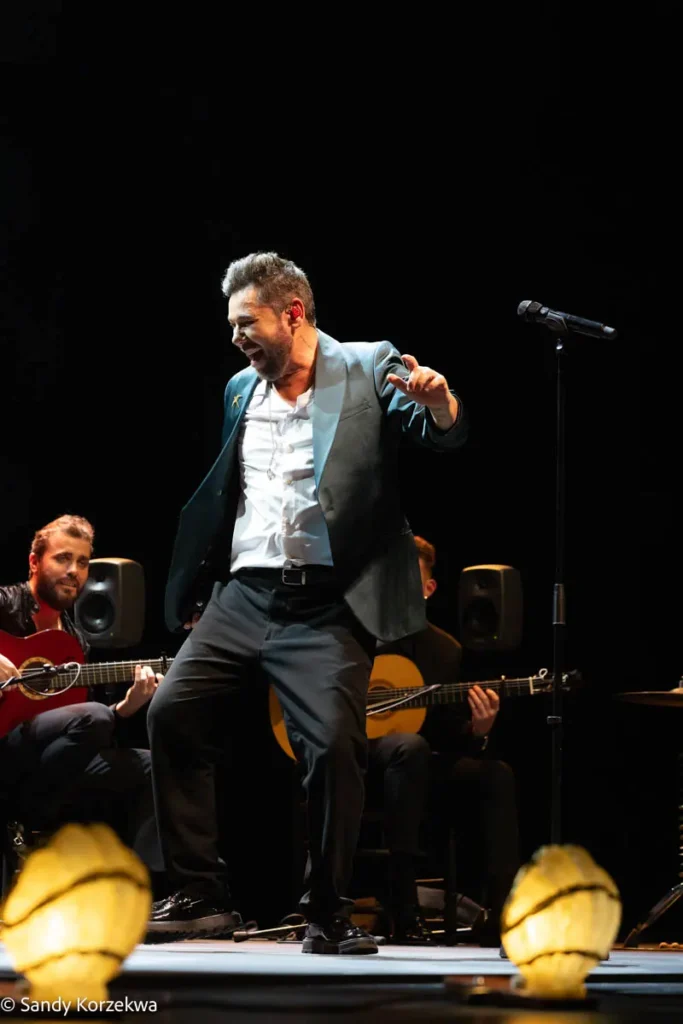 Miguel Poveda, en cambio, es un transatlántico. Es una estrella del flamenco, y lo sabe: ocupa el escenario como tal. A Nimes -donde reconoció que llevaba muchos años sin venir, también a Francia- trajo la versión reducida de su espectáculo más reciente, Poema del cante jondo. Y aun así es decir mucho, porque el formato incluía a su equipo habitual: Jesús Guerrero a la guitarra; Miguel Ángel Soto, Londro y Carlos Grilo a las palmas y el coro; Paquito González a la percusión. No sólo son todos brillantes: la maquinaria Poveda está perfectamente engrasada. Los tiempos, los picos de emoción, las entradas y salidas… todo funciona con precisión de reloj.