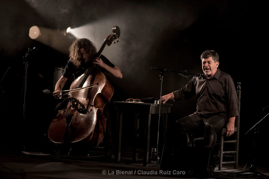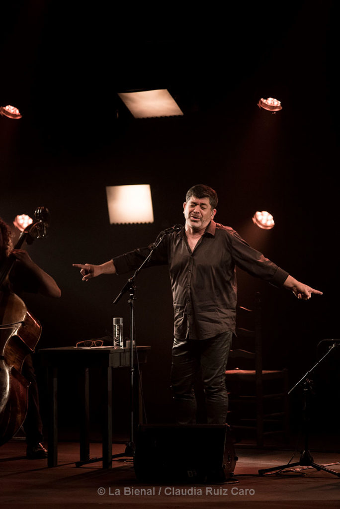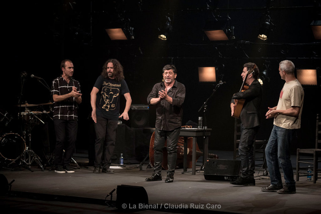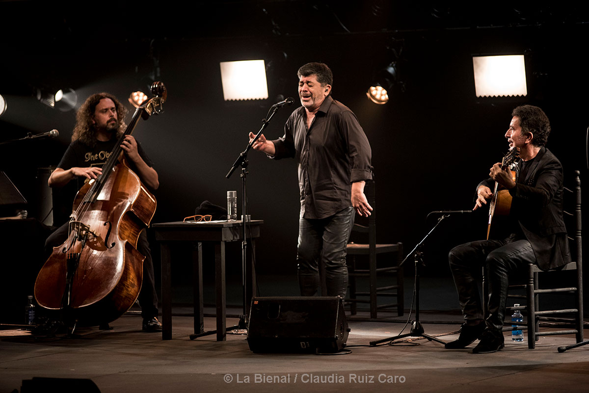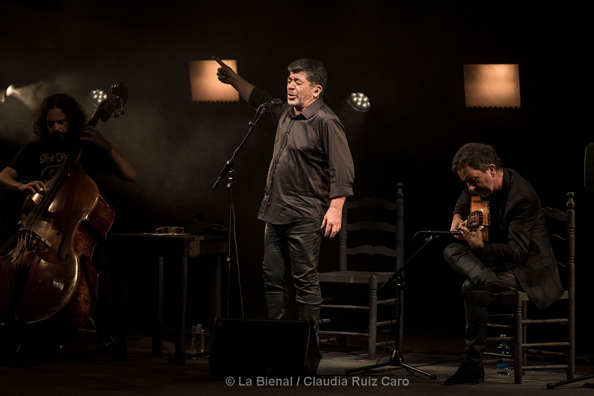 Espectáculo: Tres Golpes. Cante: Tomás de Perrate. Guitarra: Alfredo Lagos. Teclados: Alejandro Rojas-Marcos. Bajo y contrabajo: Marco Serrato. Percusiones: Antonio Moreno. Dirección artística: Pedro G. Romero. Lugar: Teatro Lope de Vega. Ciclo: XXI Bienal de Flamenco de Sevilla. Fecha: Sábado, 19 de septiembre. Aforo: Casi lleno.