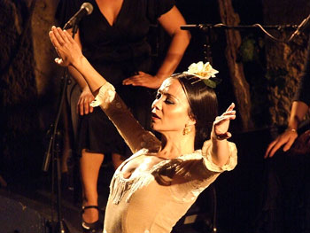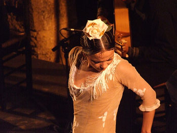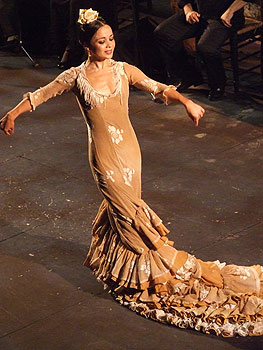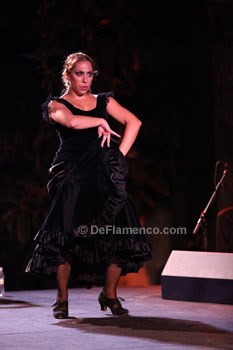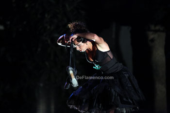 Photo gallery and video Andrés Peña & Pilar Ogalla The third night was for dancer Rosario Toledo who conjured up her autobiography through dance. We’d already seen this show which was presented in the street at the Mont de Marsan festival, and later at the Festival de Jerez. The simplicity of the idea was convincing enough. She demonstrated that with great ideas, staging and props are not necessary. The pretext was simple: the story of her life. Her beginnings in classical dance which little by little yielded to flamenco. The dancer delved in to classic Spanish dance. Remember the ballerinas in little music boxes? It was something like that, with the Vito, the Tirorarán, memories of trillas and temporeras set to rhythm, fandangos de Huelva to candlelight, castanets and bolero school. Flamenco finally arrived in the voice of Palomar por siguiriyas. Wearing basic black trousers reminiscent of Carmen Amaya, the dancer created a darkly suggestive scene in which her face said it all. But her personality blossomed in soleá, here it was the Rosario we all know. A brief interlude of cante por malagueñas, and the dancer returned sheathed in a white bata de cola with so many ruffles it looked like Cádiz Bay with rough waters. Back to the Seville school, always very present in her dance and mannerisms, certain poses reminiscent of Matilde Coral of long ago, and analagous forms of Merche Esmeralda.