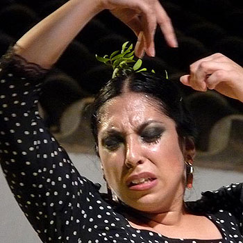 The career of twenty-six year old dancer Fuensanta la Moneta can’t be described with the hackneyed adjective “meteoric”.  From the long formative years of adolescence in the Sacromonte cave of La Rocío, to the highest dance prize of La Unión in 2003, then followed by participation in a number of companies, this is one hard-working girl.  She’s flirted with the avant-garde, without ever abandoning the classic line, the polkadots and sprig of rosemary she so proudly wears in her hair.  In fact, she is today the youngest dance star of traditional flamenco.  And God bless her for it many would say, although others would call her an impossible anachronism.  Here in La Puebla, she’s the queen of dance precisely because of her conservative approach, and this is the fourth time she’s been on the bill.  Like Pepe Torres, she brought fine voices, those of Jerez singer Miguel Lavi, and of Morón native David el Galli, in addition to the same excellent guitar-playing brothers Iglesias.  She danced soleá and siguiriya with her characteristic temperament and energy.  Hers is an intense style full of substance but short on silence – with the contrast that would be offered if she allowed subtle quiet moments, the results would be spectacularly enhanced.