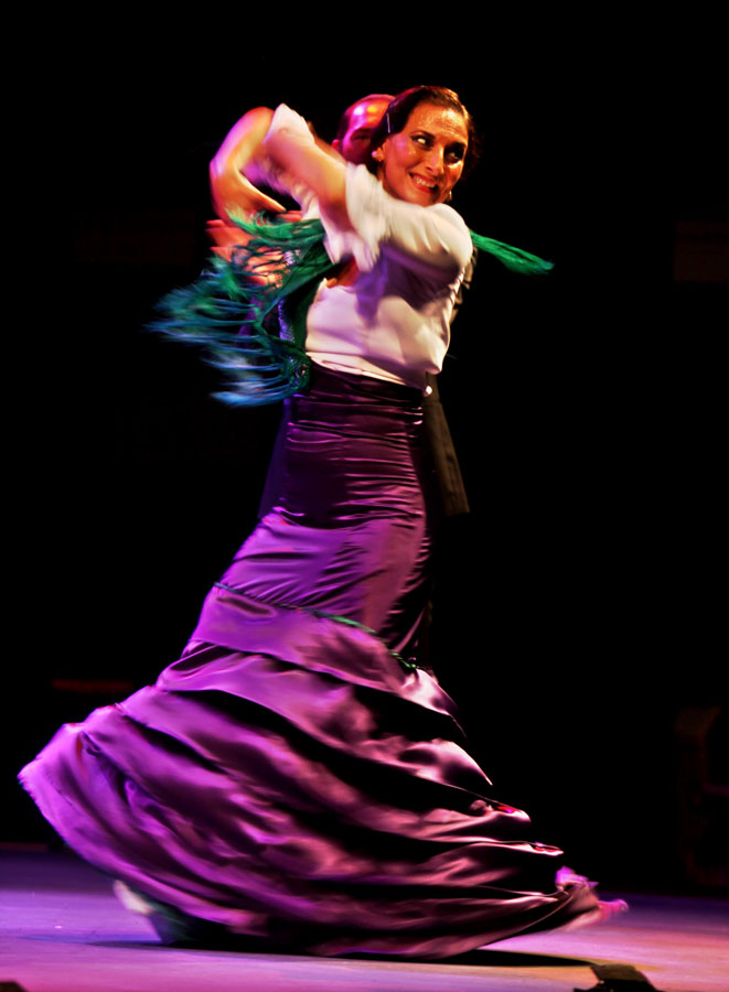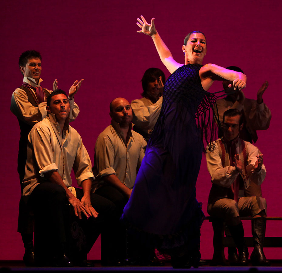 The show itself is less splashy than others the Cádiz dancer has offered, denser, darker. It depends heavily on footwork and percussion, and makes too little use of the three fine singers, Miguel Rosendo, Emilio Florido and Saúl Quirós. Too much time is spent on group numbers – after a couple of minutes of eight or ten people dancing in unison, the effect loses novelty and starts looking retro.