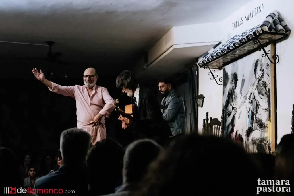 Llegó el momento del baile, y Pepe de Pura y El Galli sacaron de Rafael Campallo, Juan de los Reyes, Petete, Torombo, Choro Molina y Carmen Ledesma las almas de quienes incluso ya no están aquí, y no sólo porque estuviéramos ya en Tosantos, me refiero a esa facilidad del flamenco de conectar vivencias anteriores y traer tantos otros nombres aquí para honrar a otro de los suyos. Y más allá de nombres y estirpes -aunque hay barrios que no se pueden ignorar-, lo que llenaba los corazones, es algo que a buen seguro pasa en otros oficios y disciplinas, pero en el flamenco, ¡ay! Qué manera de hacer mejores a los demás. Qué sabiduría para sostener al otro en su búsqueda, en sus virguerías y cuando yerra. Cómo seguirle con la mirada y proyectar el cuerpo hacia el otro, cuidarle, recogerle, hacer un hechizo de protección, qué sé yo. Qué forma de estar ahí para los demás. Por eso tiene tanto sentido que Sevilla rinda honores así a quien ha fomentado esa forma de hacer, a uno de los soberanos de la artillería flamenca contemporánea.