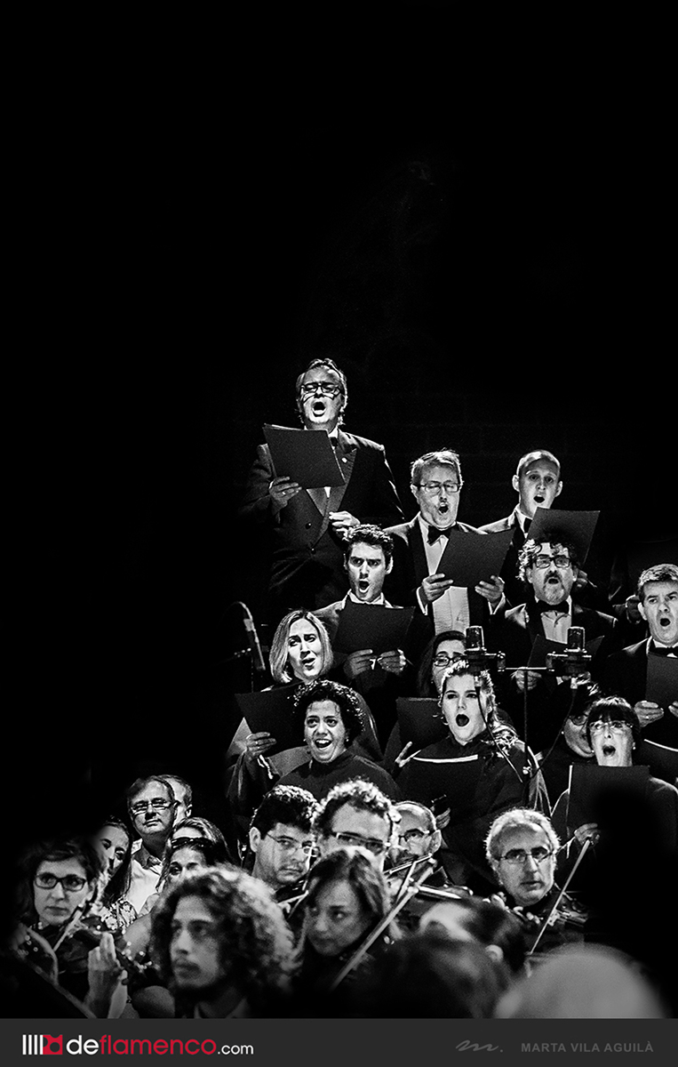 Morente sang fandangos with orchestra and guitar, which led to the Rito de la Paz with the flamenco group. All together, and following the lead of Paco Suárez, the musical director of this project. Tonás also had a place in this mass, with local singer Yoli Muñoz. The Lord's Prayer was sung por tangos by Remedios Amaya. The Rito de la Paz: «Let us all hold hands». Kike Morente with siguiriyas to orchestra and guitar. This was the moment dancer Juan Ramírez from Badajoz made time to carry out the communion. Everyone present, believers or not, overcome with emotion knowing this was a historic and unrepeatable moment. People were standing, looking for any little space to see what was happening Paco Suárez' highly personalized version of Schubert's Ave María. Chorus, orchestra, guitar and Remedios Amaya. The works, after an hour and a half. «Podéis ir en Paz» to tango-rumba from the beginning of the mass. Maestro Paco Suárez called for all those present to clap in time. «The love of God has power».
