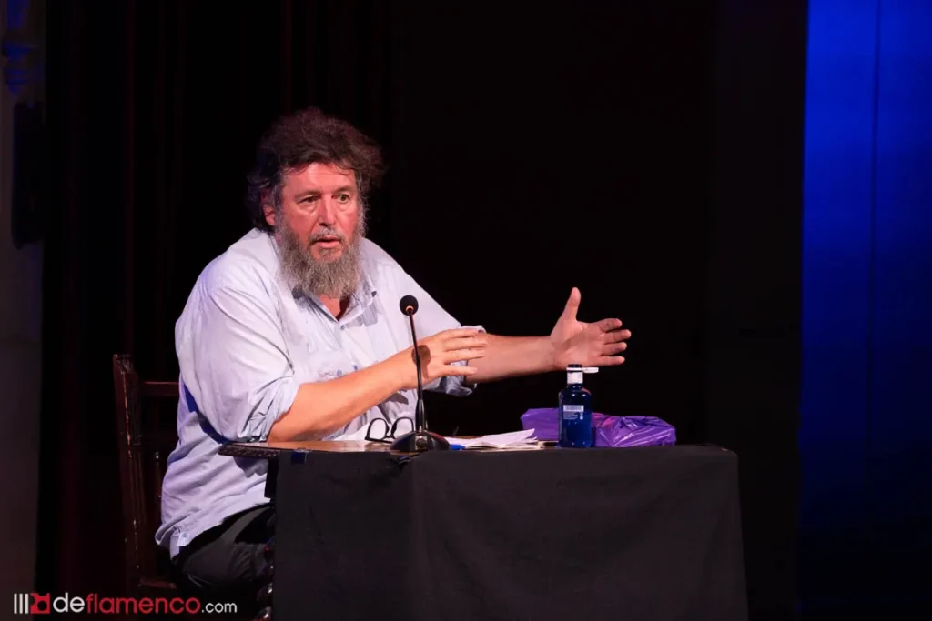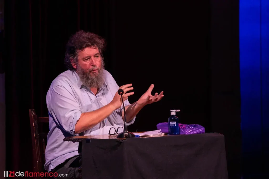 La ponencia de Pedro G Romero comenzó dubitativa con una cita a José Bergamín: «buscar las raíces es solo la forma subterránea del aéreo irse por las ramas». Luego explicó que en principio iba a hablar de por qué el cante no ha alcanzado el grado de “libertinaje” que tienen la guitarra y el baile flamenco en la actualidad… mientras tanto en la web la cosa se anuncia como “El flamenco antes y después del flamenco”.