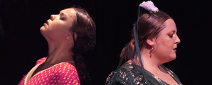 There’s also the stage presence (as I said, this girl is becoming a woman right on stage). And the biographical details: Laura speaks from off-stage in what seems to be a journalist’s interview of Rocío. And Rocío dances each one of the words, the syllables, the vowels and consonants with their silences. And then, vice versa. Sky and earth. Tradition and creation. Stillness and frenzy. Receiving and giving. Two necessary and complementary truths, although there is the occasional glitch, some friction. All affection involves friction, as you know. Rocío the actress, receiving the audience dressed as a stewardess, playing the adolescent, which she is, seductress and child. Or as young mistress of this art. With no underpinning of any kind, and all the naturalness of breathing. In many ways she is today’s most important dancer. That’s how it is, don’t ask me why. She’s growing so fast, you have to say she’s 23. Biographic irony. The handicaps we all have to deal with; in Rocío’s case, not very many, whether due to her own willpower, or because the gods smile upon her. Or both. Rocío laughs at her handicaps, at her critics. And at herself, naturally. The end is a pas de deux with bata de cola and castanets, wood that sounds like metal, “Tres Morillas de Jaén”, a popular song, and it wasn’t the only one of the night (there was also bossa nova, lyrical song, bolero, jota…even flamenco), in which the melody was suggested by the guitar and the dancer’s feet, while the human voice opens and closes with trilla. And the fiesta finale is a rip-roaring rumba. Viva life! The closing is an everyday scene, almost quaint, the two girls look at themselves in a mirror, argue over the mirror and play with it. And the mirror is us. The audience. And everything without grinding any axe, as easy as breathing in and out. |