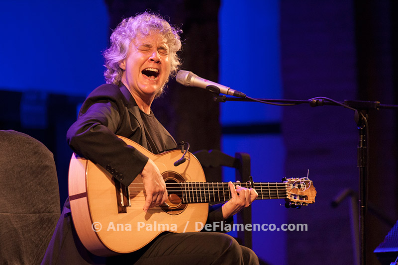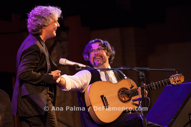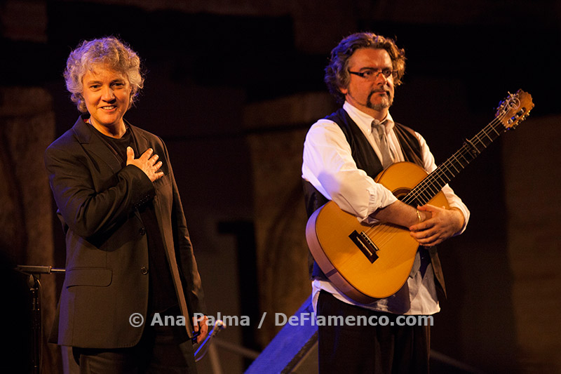 Mayte isn’t afraid to take risks, and easily takes on malagueña with rondeña and fandango of Yerbabuena before delving into seguiriya and fandango de Huelva. Between cantiñas, garrotón and bulerías, there isn’t much space in her creative mind, in her personal way of delivering the cantes and giving them melismatic shading. With the same enthusiasm she does all this, she just as easily takes on bulerías of Lole and Manuel accompanying herself on guitar, as Paco de Montilla and Anilla de Ronda did at the end of the nineteenth century. The rest of the recital was Juan Ramón Caro who was in charge of backing up Mayte’s singing.