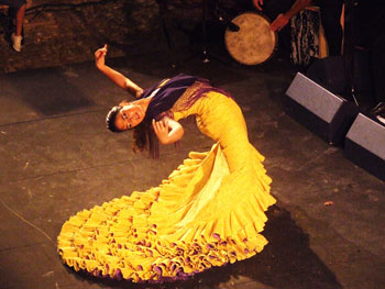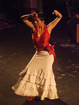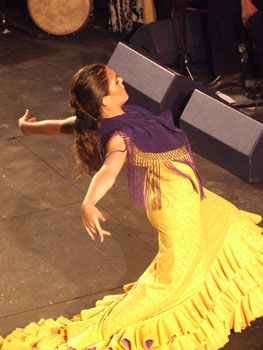 The last dance show at the Corral of the second week. Alba Heredia is still really a child, but she dances like a woman. Or perhaps it’s her dancing that makes her an adult. She’s only fourteen, and you’d think that’s how long she’s been dancing. You can tell where she’s from, the family she’s from and the neighborhood. This girl is going to make quite a stir. She’s a diamond in the rough, and of course needs to be polished, but her talent will carry her through. She was backed up by singers Juañares whose bulerías were much applauded, and Rafi Heredia. The guitars of Emilio Maya and Pepe Marote were a strong guarantee for the music. The percussion was Ely Maya and the palmas of Juan Andrés Maya and Iván Vargas. It’s all in the family. A contemporary taranto revealed her dynamic style. Very accelerated, abrupt in the turns, very much the style of the people she has grown up surrounded by. Like la Moneta, her facial expression crosses the space that separates the audience from the stage. She finished with alegrías, in high pants and short jacket, very much the bullfighter stalking the big bull and leading it around at will. Her best point is her arms which she knows how to use in combination with the sound of her footwork, agile and powerful. More information 2nd week: |