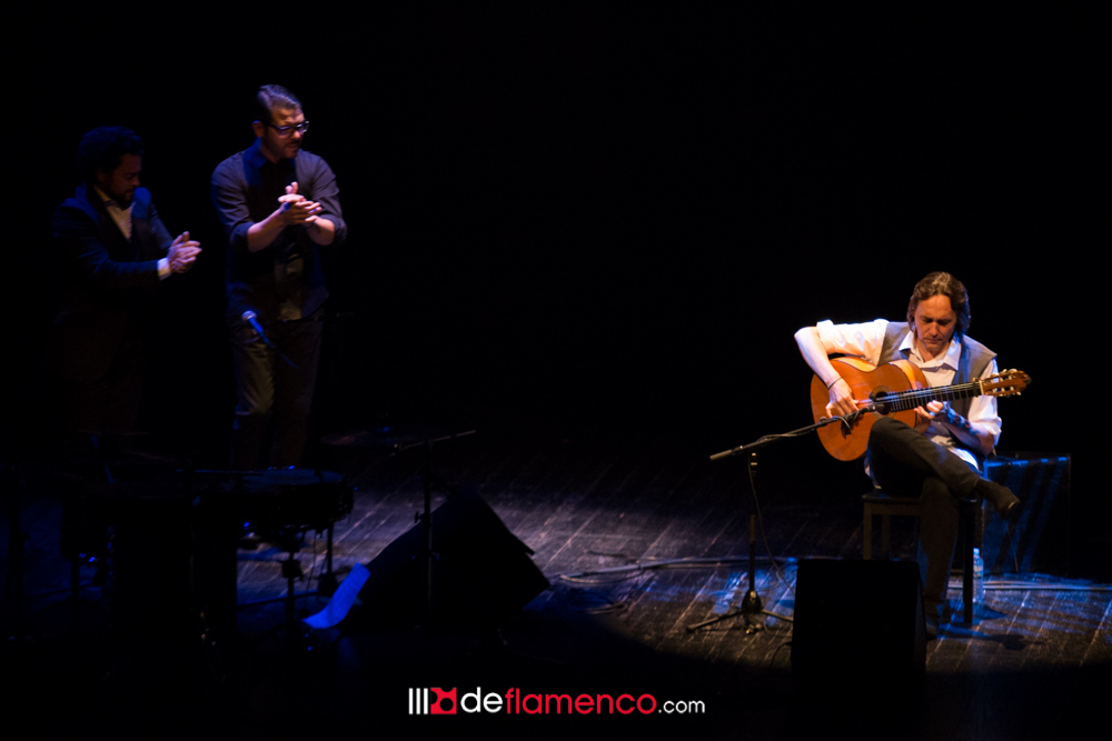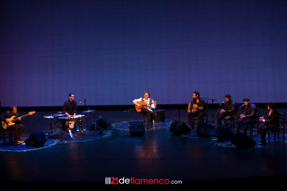 Vicente Amigo, acompañado de Añil Fernández (segunda guitarra), Paquito González (percusión), Ewen Vernal (bajo) y Rafael de Utrera (cante), Los Mellis, coros y compás.