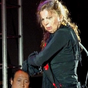 A continuación, nuestro presentador Bohórquez lamenta la ausencia de Mayte Martín en los festivales de Andalucía. He sido testigo de la polémica que surge cuando Mayte ha cantado en determinados lugares. Es catalana y no es gitana, y tristemente esa combinación de circunstancias es superior a los límites de la afición de algunos. Durante el día más de uno me había expresado el temor de que Mayte no fuera debidamente apreciada en el Gazpacho. Pero en Morón, la sierra está cerca, y hay el gusto por un tipo de cante que se aleja del tópico “racial” y las voces rajás. La intervención de la cantaora, intensa, discreta y comedida, con todo el aplomo y seriedad que le caracterizan, fue de muy buen nivel. Por granaína, demostró que hay muchas maneras de “herir”, y que la suya es una exquisitez. Con Juan Ramón Caro a la guitarra, otro maestro, cantó malagueña de Peñaranda y de Chacón, cerrando con rondeña y Frasquito; se agradece la dimensión de la afición de Mayte Martín. No hay alardes técnicos ni remates dramáticos, pero el público, embelesado, se pone en pie para esta catalana no gitana. Los fandangos de Huelva fue otro regalo para los sentidos, con un surtido casi nostálgico de estilos…Santa Eulalia, Calañas, etc…con la “novedad” de cantar los versos clásicos asociados que todos conocemos. Está bien renovar la poesía del cante, pero no vayamos a rechazar el rico acervo existente. Anuncia cantiñas para cerrar, pero luego se decide por bulerías. Juan Ramón Caro despacha un compás tranquilito, y la voz de miel cristalizada de Mayte termina de seducir a los presentes con cuplé bien escogido. Surgen los primeros gritos de la noche de “¡otra, otra!”, pero la señora se retira tan discretamente como llegó.