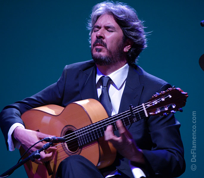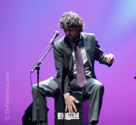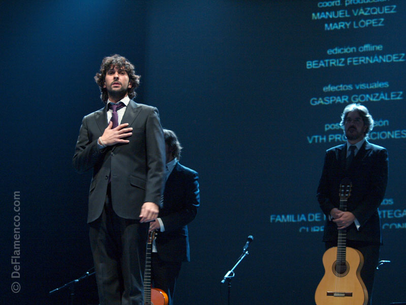 It’s probably worse to pay attention to the most radical factions regarding purity in flamenco. However, if the artist feels the need to take a stand and defend his ideas, there must be some reason for it. Aside from all this, Arcángel is a singer who does traditional flamenco with a personal touch, a product of his times who on occasion has lent his voice to other musical genres and styles; whether or not you like his singing is another issue. Even the use of the audiovisual element, present throughout the show, can be considered a modernism with regard to earlier times, but becoming common these days. Putting the wrapper aside, what’s mostly left is the fact that Arcángel gave quite a recital. He began with the recorded repertoire of Caracol from his participation in the Granada contest of 1922. Siguiriya, soleá and saeta, accompanied by the image of a Holy Week procession. The singer delivered these cantes onn his own terms, based on his own abilities; if there’s anything you can say about Arcángel, it’s that you can tell he’s a real pro and works everything over meticulously, making use of his flexible voice to reach highs and lows, softness or intensity, sweetness and absolute commitment.