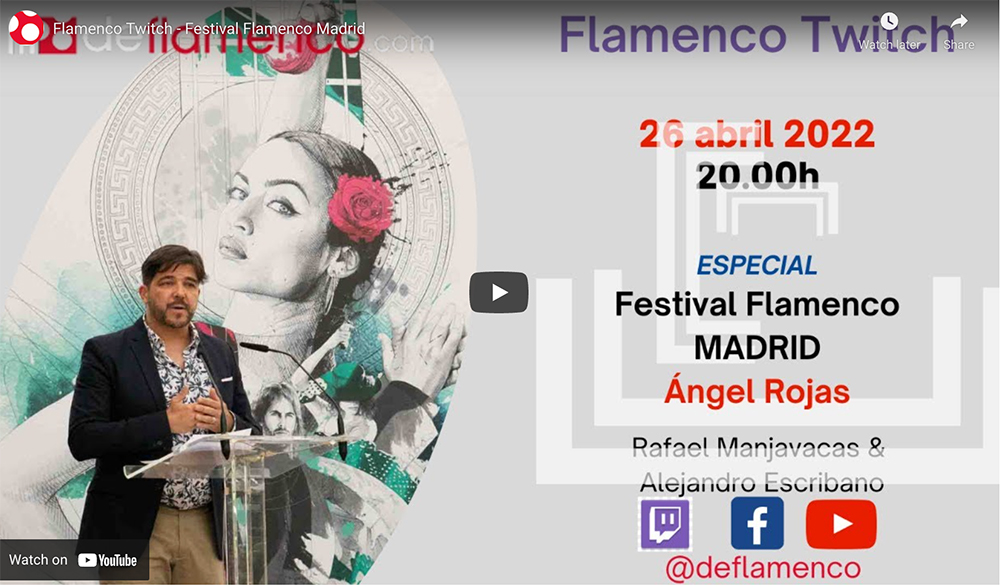 En nuestro programa semanal de streaming ‘Flamenco Twitch’ entrevistamos al Director del Festival Flamenco Madrid, el bailaor y coreógrafo Ángel Rojas que nos cuenta la programación de la nueva edición del Festival tras dos años sin poder llevarse a cabo y tras su vuelta a la dirección del mismo. El Festival se celebra del 11 al 29 de mayo, se presentó el 26 de abril en el Invernadero de Arganzuela (Matadero) en Madrid.