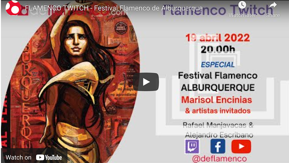En Flamenco Twitch hablamos con MARISOL ENCINIAS y EVA ENCINIAS del 35 Festival Flamenco de ALBURQUERQUE (EEUU) sobre la edición de este año 2022 que se celebrará del 11 al 18 de junio 2022. Nos acompañan en el streaming algunos de los artistas que participan en esta edición, Rafael Estévez, José Maya y Alfonso Losa.