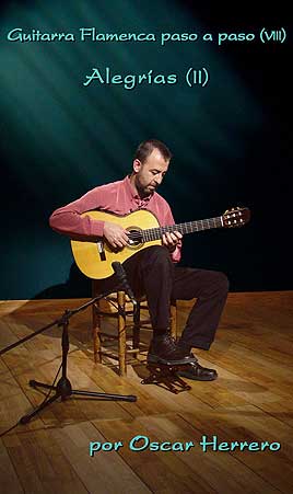 50 minutos. Oscar herrero explica detalladamente todos los elementos que componen el toque por Alegría en tonalidad DO (C) y de LA (A), tonalidades que se emplean con frecuencia para acompañar al cante por Alegrías.
